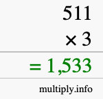 As you can see from the illustration above, the answer to 511 times 3 is the green number in the bottom row. The answer is 1,533.
