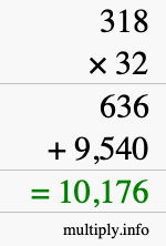 As you can see from the illustration above, the answer to 318 times 32 is the green number in the bottom row. The answer is 10,176.