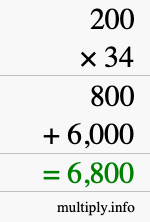 Here you will learn how to calculate 200 multiplied by 34 using long multiplication. In other words, learn how to use long multiplication to find the answer to 200 times 34. We will first give you step-by-step instructions, and then we will illustrate with an image what we did.