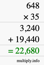 As you can see from the illustration above, the answer to 648 times 35 is the green number in the bottom row. The answer is 22,680.