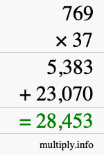 As you can see from the illustration above, the answer to 769 times 37 is the green number in the bottom row. The answer is 28,453.