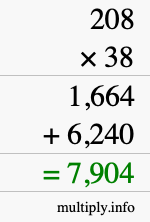 As you can see from the illustration above, the answer to 208 times 38 is the green number in the bottom row. The answer is 7,904.