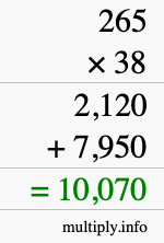 Then we multiply the ones digit of 38 with each digit of 265, and write the products in the next row, from right to left. (If the product is greater than 9, carry the tens digit to the next column.)