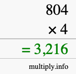 As you can see from the illustration above, the answer to 804 times 4 is the green number in the bottom row. The answer is 3,216.