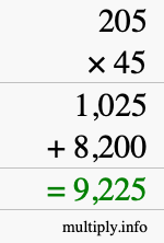As you can see from the illustration above, the answer to 205 times 45 is the green number in the bottom row. The answer is 9,225.