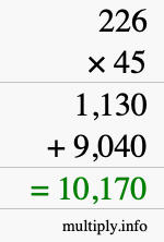 Here you will learn how to calculate 226 multiplied by 45 using long multiplication. In other words, learn how to use long multiplication to find the answer to 226 times 45. We will first give you step-by-step instructions, and then we will illustrate with an image what we did.
