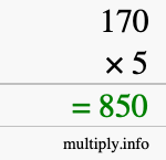 Here you will learn how to calculate 170 multiplied by 5 using long multiplication. In other words, learn how to use long multiplication to find the answer to 170 times 5. We will first give you step-by-step instructions, and then we will illustrate with an image what we did.