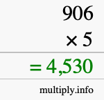Here you will learn how to calculate 906 multiplied by 5 using long multiplication. In other words, learn how to use long multiplication to find the answer to 906 times 5. We will first give you step-by-step instructions, and then we will illustrate with an image what we did.
