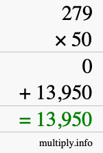As you can see from the illustration above, the answer to 279 times 50 is the green number in the bottom row. The answer is 13,950.