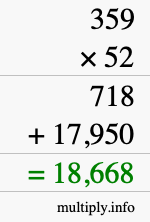 As you can see from the illustration above, the answer to 359 times 52 is the green number in the bottom row. The answer is 18,668.