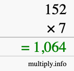 As you can see from the illustration above, the answer to 152 times 7 is the green number in the bottom row. The answer is 1,064.