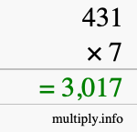 As you can see from the illustration above, the answer to 431 times 7 is the green number in the bottom row. The answer is 3,017.