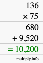 Here you will learn how to calculate 136 multiplied by 75 using long multiplication. In other words, learn how to use long multiplication to find the answer to 136 times 75. We will first give you step-by-step instructions, and then we will illustrate with an image what we did.