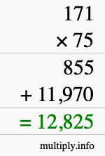 Here you will learn how to calculate 171 multiplied by 75 using long multiplication. In other words, learn how to use long multiplication to find the answer to 171 times 75. We will first give you step-by-step instructions, and then we will illustrate with an image what we did.