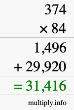 As you can see from the illustration above, the answer to 374 times 84 is the green number in the bottom row. The answer is 31,416.