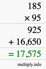 Here you will learn how to calculate 185 multiplied by 95 using long multiplication. In other words, learn how to use long multiplication to find the answer to 185 times 95. We will first give you step-by-step instructions, and then we will illustrate with an image what we did.
