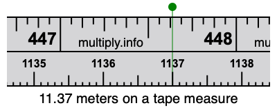 11.37 meters times 39.3701 equals 447.638037 inches. Therefore, 11.37 meters is also at the 447.638037 inches place on the tape measure, as displayed above.