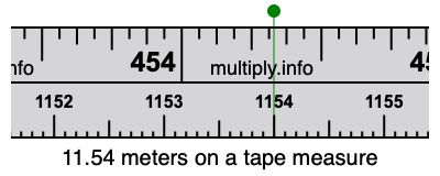 11.54 meters times 100 equals 1154 centimeters. Therefore, 11.54 meters is at the 1154 centimeters place on the tape measure, as displayed below.