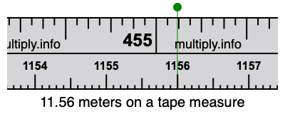 11.56 meters times 39.3701 equals 455.118356 inches. Therefore, 11.56 meters is also at the 455.118356 inches place on the tape measure, as displayed above.