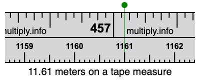 11.61 meters times 39.3701 equals 457.086861 inches. Therefore, 11.61 meters is also at the 457.086861 inches place on the tape measure, as displayed above.
