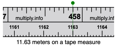 11.63 meters times 39.3701 equals 457.874263 inches. Therefore, 11.63 meters is also at the 457.874263 inches place on the tape measure, as displayed above.