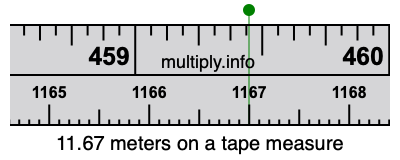 11.67 meters times 39.3701 equals 459.449067 inches. Therefore, 11.67 meters is also at the 459.449067 inches place on the tape measure, as displayed above.