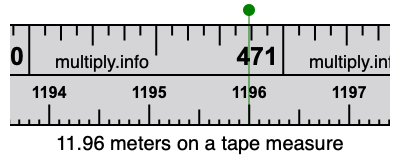 11.96 meters times 39.3701 equals 470.866396 inches. Therefore, 11.96 meters is also at the 470.866396 inches place on the tape measure, as displayed above.