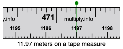 11.97 meters times 39.3701 equals 471.260097 inches. Therefore, 11.97 meters is also at the 471.260097 inches place on the tape measure, as displayed above.