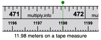 11.98 meters times 39.3701 equals 471.653798 inches. Therefore, 11.98 meters is also at the 471.653798 inches place on the tape measure, as displayed above.