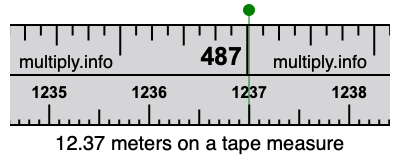 12.37 meters times 39.3701 equals 487.008137 inches. Therefore, 12.37 meters is also at the 487.008137 inches place on the tape measure, as displayed above.