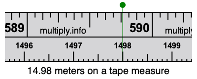 14.98 meters times 100 equals 1498 centimeters. Therefore, 14.98 meters is at the 1498 centimeters place on the tape measure, as displayed below.