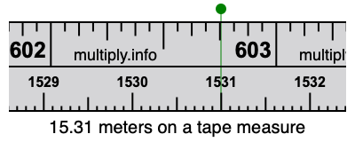 15.31 meters times 100 equals 1531 centimeters. Therefore, 15.31 meters is at the 1531 centimeters place on the tape measure, as displayed below.