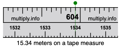 15.34 meters times 39.3701 equals 603.937334 inches. Therefore, 15.34 meters is also at the 603.937334 inches place on the tape measure, as displayed above.
