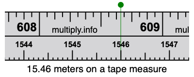 15.46 meters times 100 equals 1546 centimeters. Therefore, 15.46 meters is at the 1546 centimeters place on the tape measure, as displayed below.