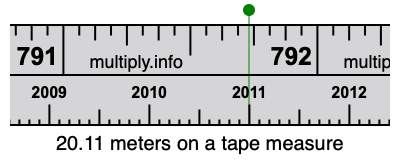 20.11 meters times 39.3701 equals 791.732711 inches. Therefore, 20.11 meters is also at the 791.732711 inches place on the tape measure, as displayed above.