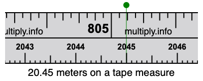 20.45 meters times 39.3701 equals 805.118545 inches. Therefore, 20.45 meters is also at the 805.118545 inches place on the tape measure, as displayed above.