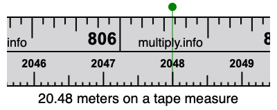 20.48 meters times 100 equals 2048 centimeters. Therefore, 20.48 meters is at the 2048 centimeters place on the tape measure, as displayed below.