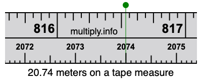 20.74 meters times 39.3701 equals 816.535874 inches. Therefore, 20.74 meters is also at the 816.535874 inches place on the tape measure, as displayed above.