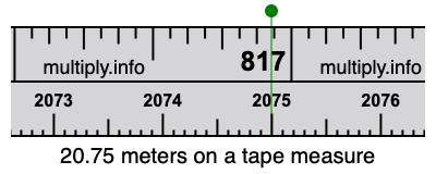 20.75 meters times 39.3701 equals 816.929575 inches. Therefore, 20.75 meters is also at the 816.929575 inches place on the tape measure, as displayed above.