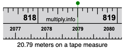 20.79 meters times 39.3701 equals 818.504379 inches. Therefore, 20.79 meters is also at the 818.504379 inches place on the tape measure, as displayed above.