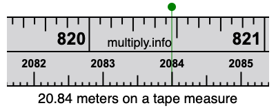 20.84 meters times 39.3701 equals 820.472884 inches. Therefore, 20.84 meters is also at the 820.472884 inches place on the tape measure, as displayed above.