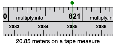 20.85 meters times 100 equals 2085 centimeters. Therefore, 20.85 meters is at the 2085 centimeters place on the tape measure, as displayed below.