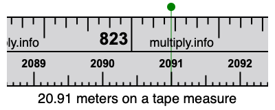 20.91 meters times 100 equals 2091 centimeters. Therefore, 20.91 meters is at the 2091 centimeters place on the tape measure, as displayed below.