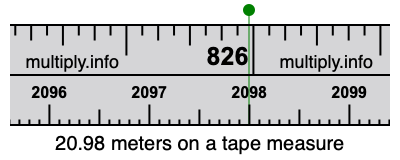 20.98 meters times 39.3701 equals 825.984698 inches. Therefore, 20.98 meters is also at the 825.984698 inches place on the tape measure, as displayed above.