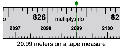 20.99 meters times 100 equals 2099 centimeters. Therefore, 20.99 meters is at the 2099 centimeters place on the tape measure, as displayed below.