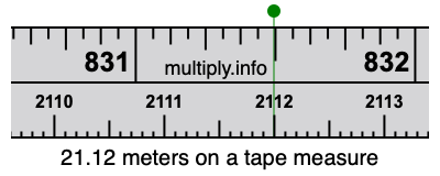 21.12 meters times 100 equals 2112 centimeters. Therefore, 21.12 meters is at the 2112 centimeters place on the tape measure, as displayed below.