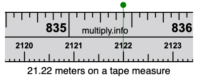 21.22 meters times 39.3701 equals 835.433522 inches. Therefore, 21.22 meters is also at the 835.433522 inches place on the tape measure, as displayed above.