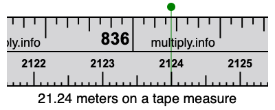 21.24 meters times 39.3701 equals 836.220924 inches. Therefore, 21.24 meters is also at the 836.220924 inches place on the tape measure, as displayed above.