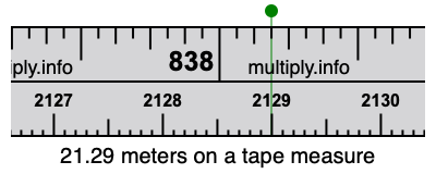 21.29 meters times 39.3701 equals 838.189429 inches. Therefore, 21.29 meters is also at the 838.189429 inches place on the tape measure, as displayed above.