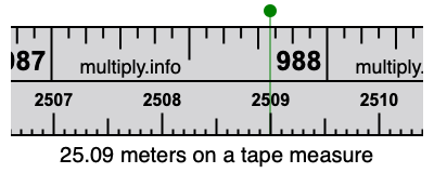 25.09 meters times 100 equals 2509 centimeters. Therefore, 25.09 meters is at the 2509 centimeters place on the tape measure, as displayed below.